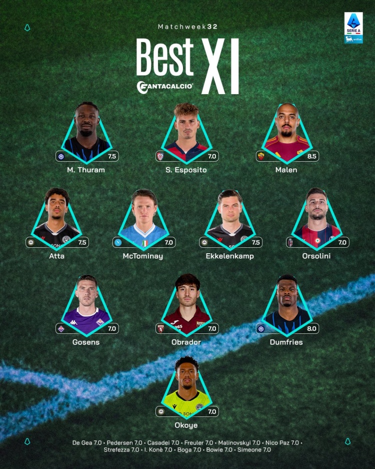 意甲官方第32轮最佳阵:马库斯·图拉姆、邓弗里斯领衔,小麦在列