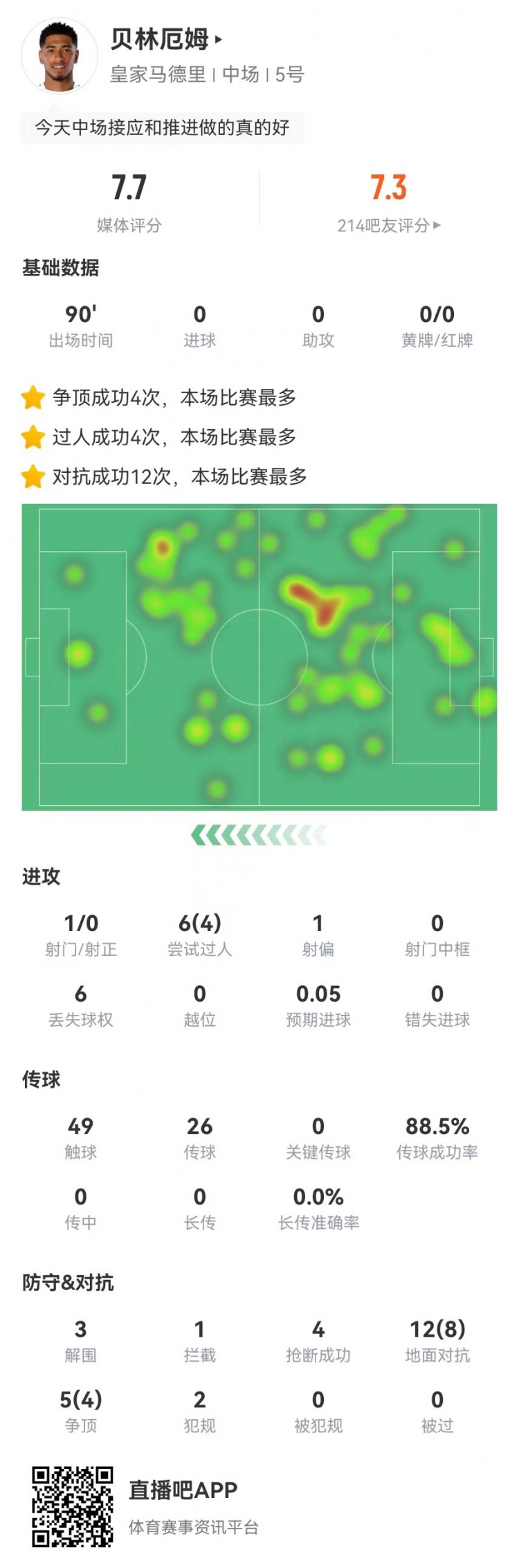 贝林厄姆本场1射+0关键传球 3解围4抢断+17对抗12成功 获评7.7分